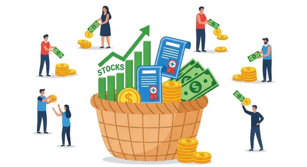 A mutual fund pools money from thousands of investors to buy a collection of stocks, bonds, or other securities. Think of it as a large basket where everyone contributes money, and a professional manager decides what to put in that basket.